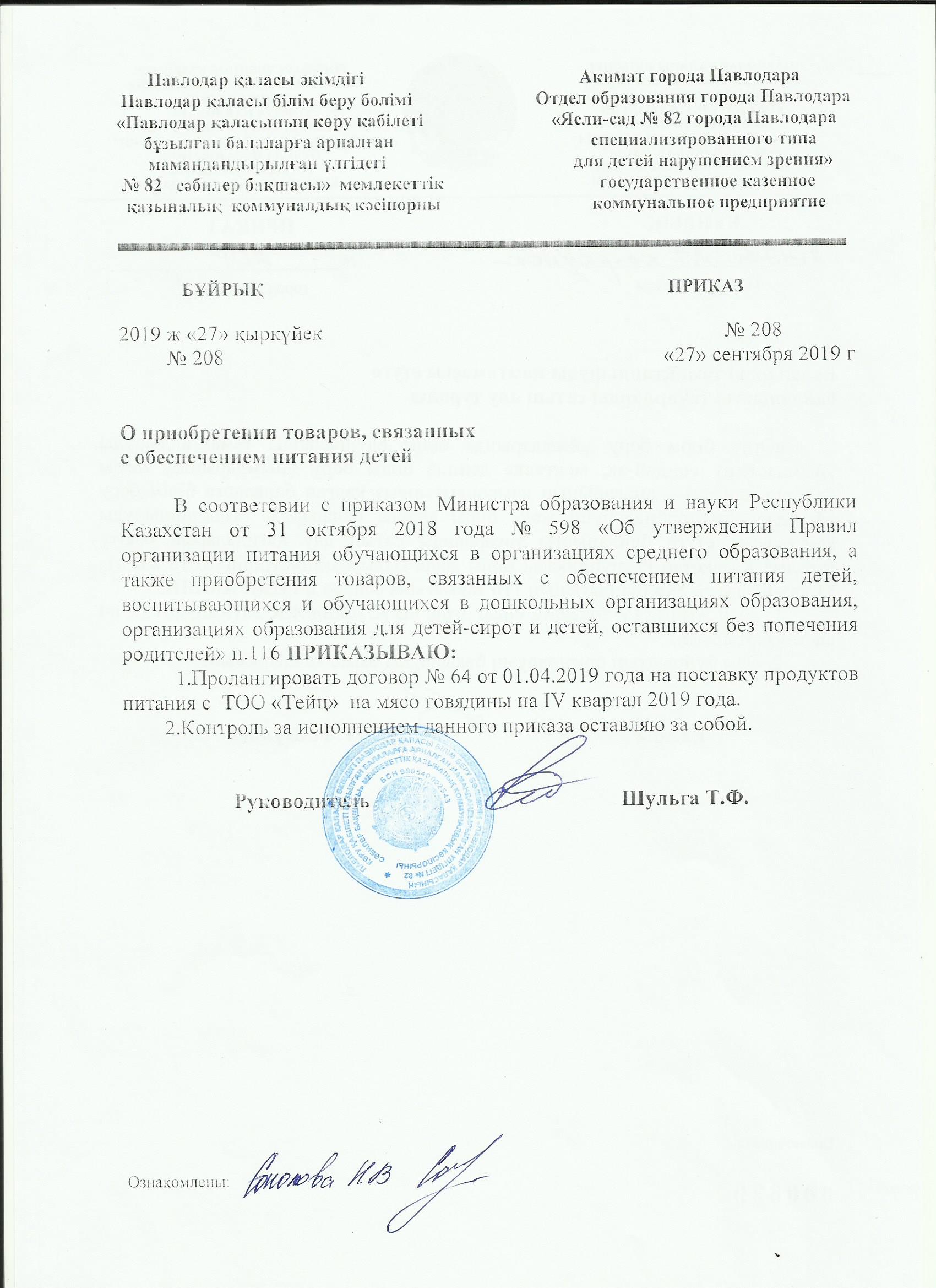 Приказ о продлении договора ТОО Тейц на 4 кв 2019 г. | көшіріп алу |