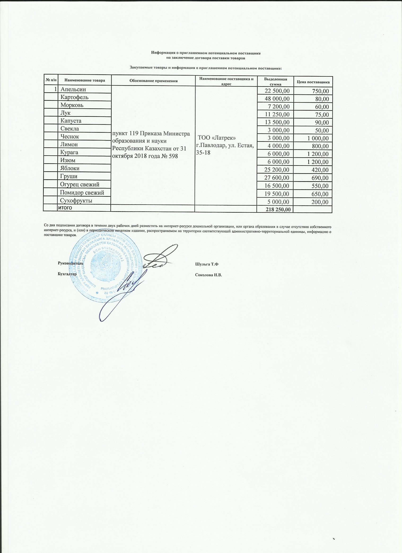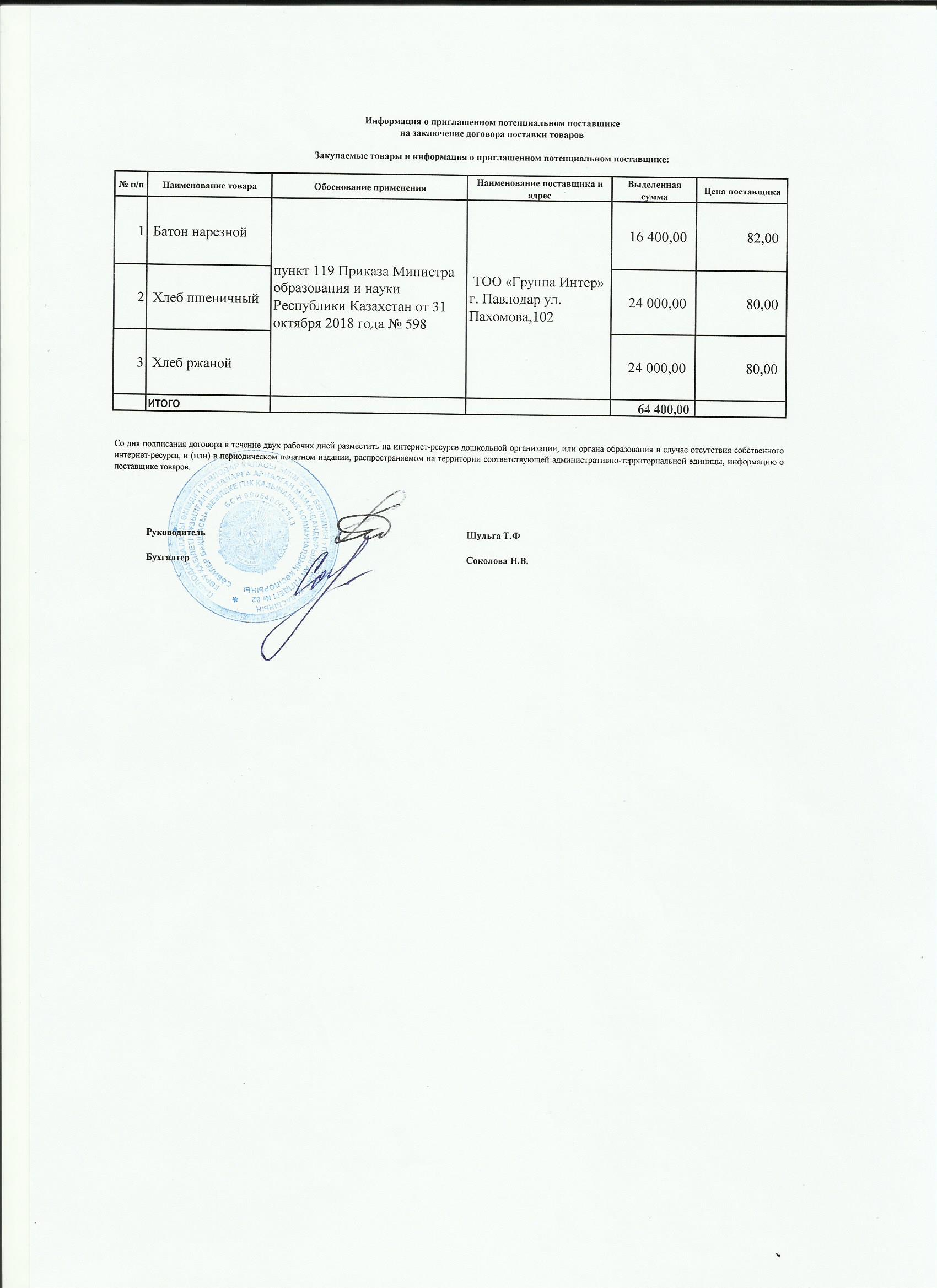 Информация о приглашенном поставщике ТОО Группа Интер 02.10.2019 | көшіріп алу |