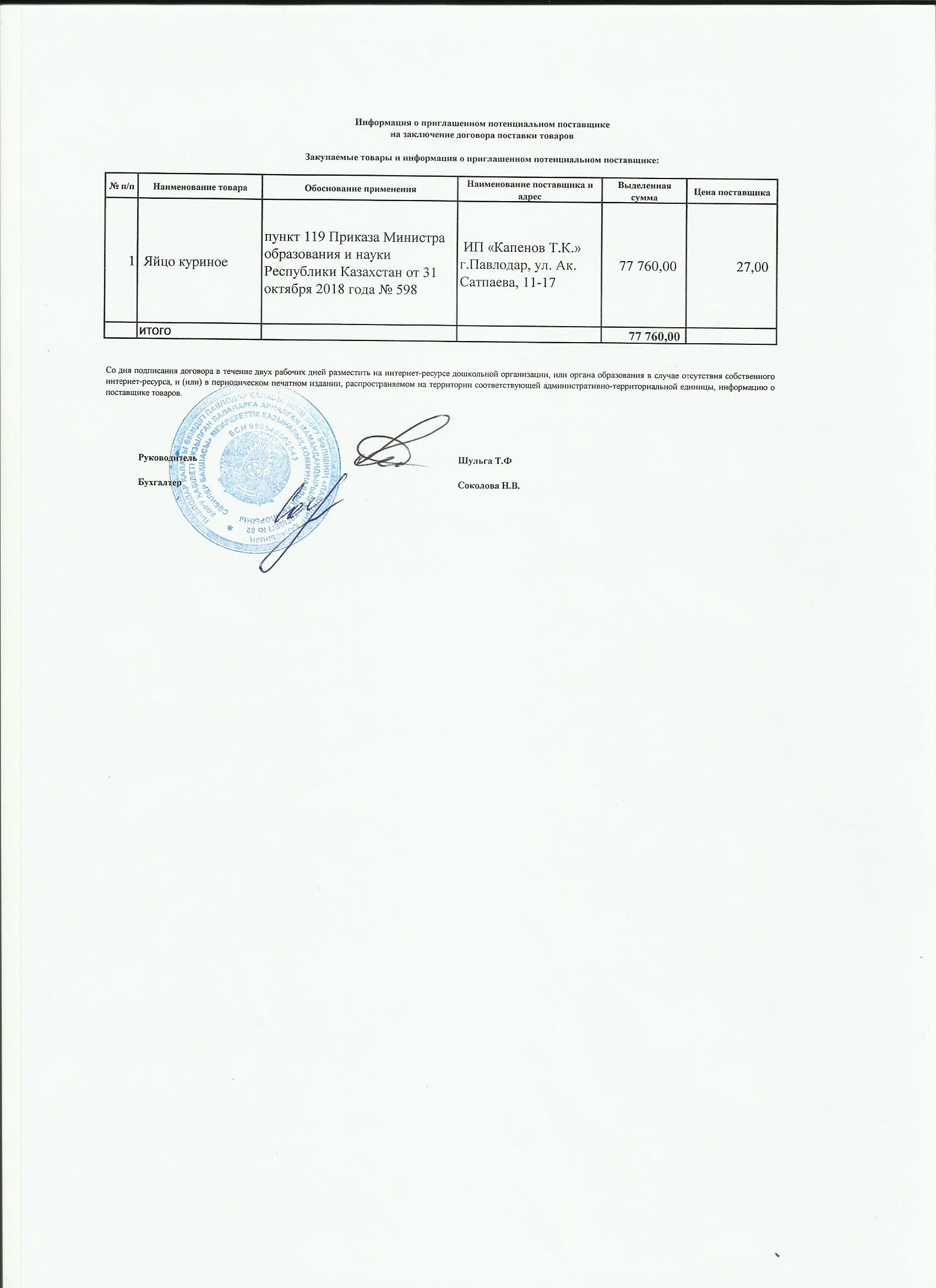 Информация о приглашенном поставщике ИП Капенов 02.10.2019 | көшіріп алу |