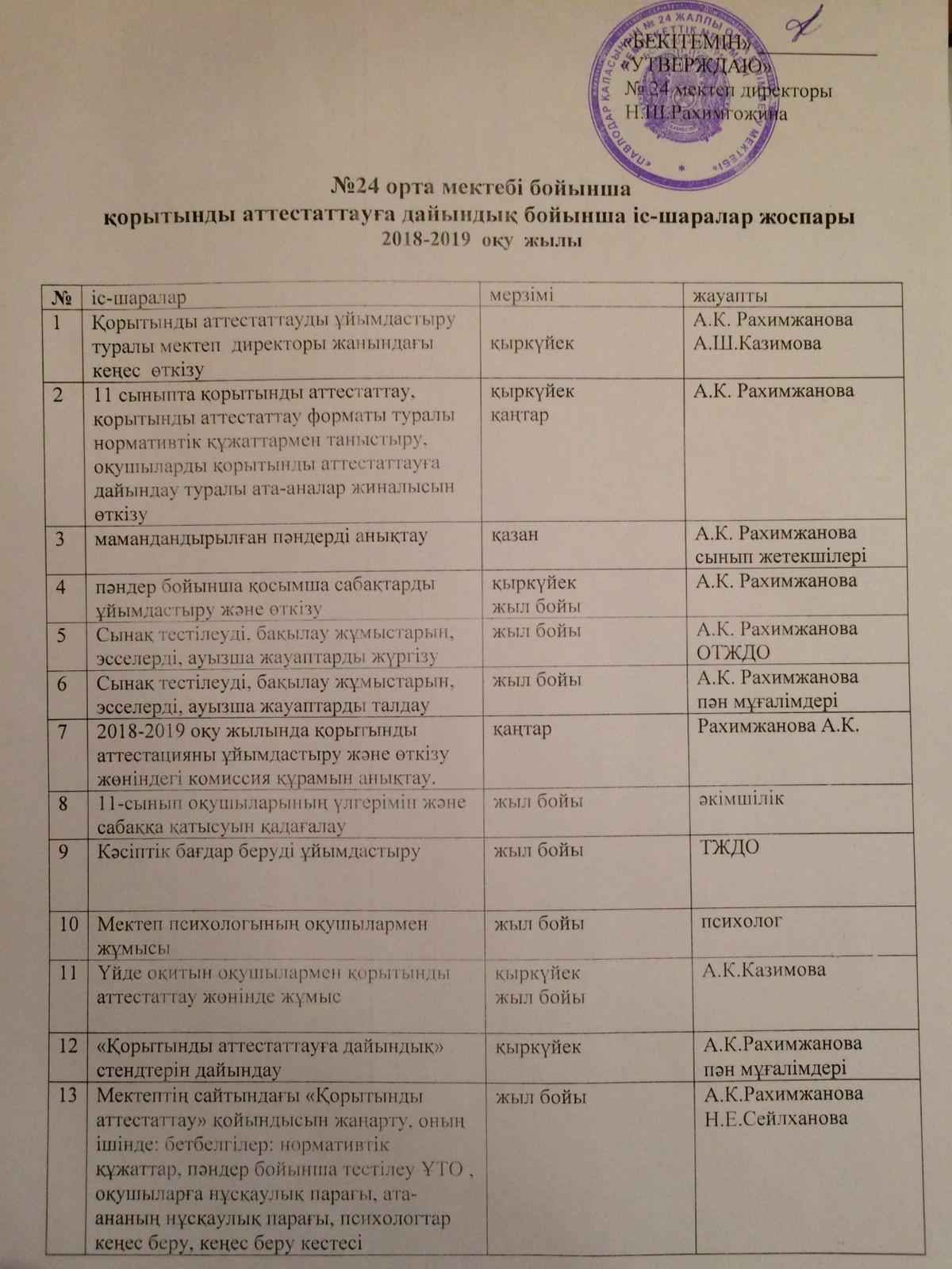 №24 орта мектебі бойынша қортынды аттестаттауға дайындық бойынша іс-шаралар жоспары 2018-2019 оқу жылы | көшіріп алу |