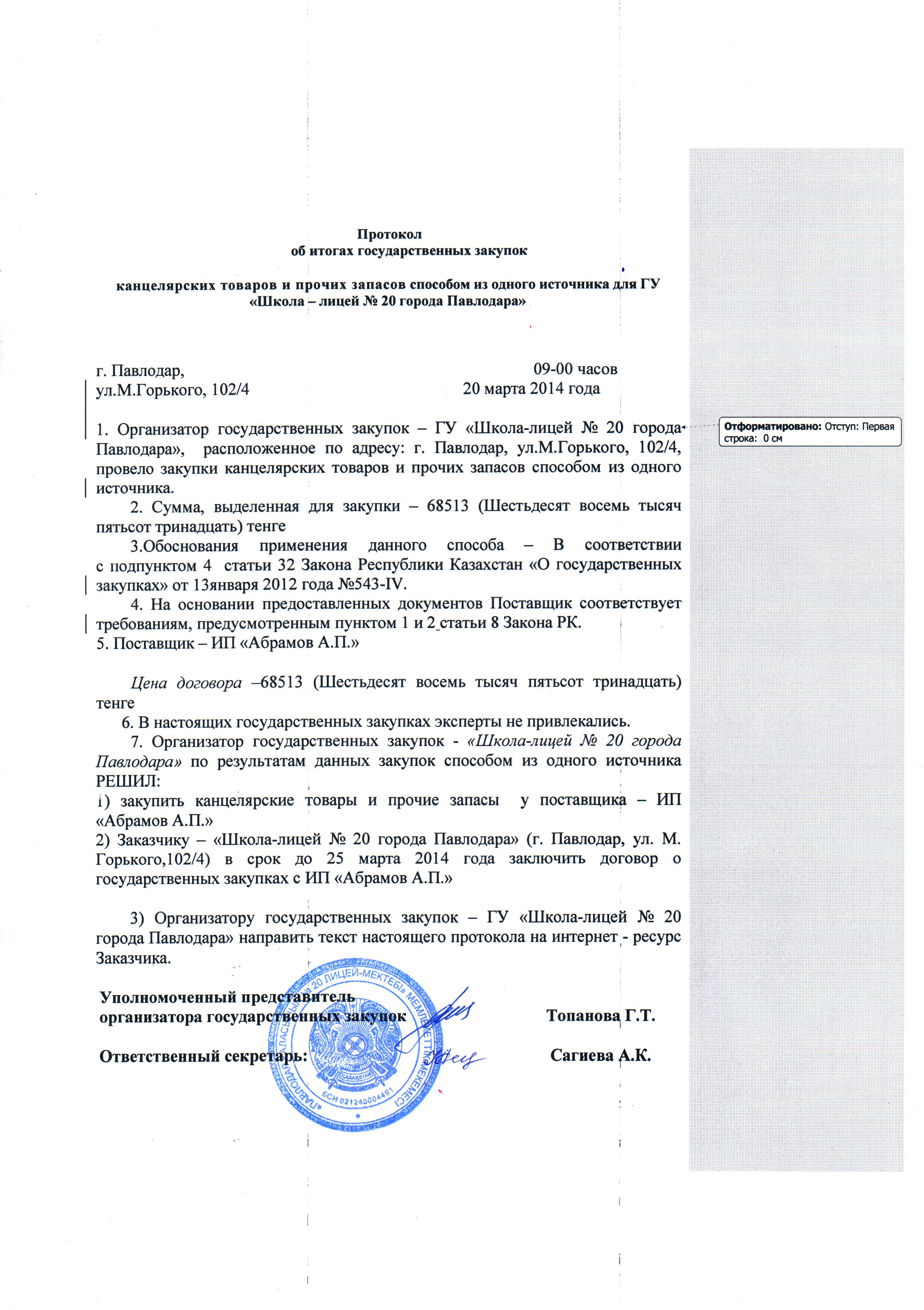 Протокол об итогах государственных закупок | Скачать |