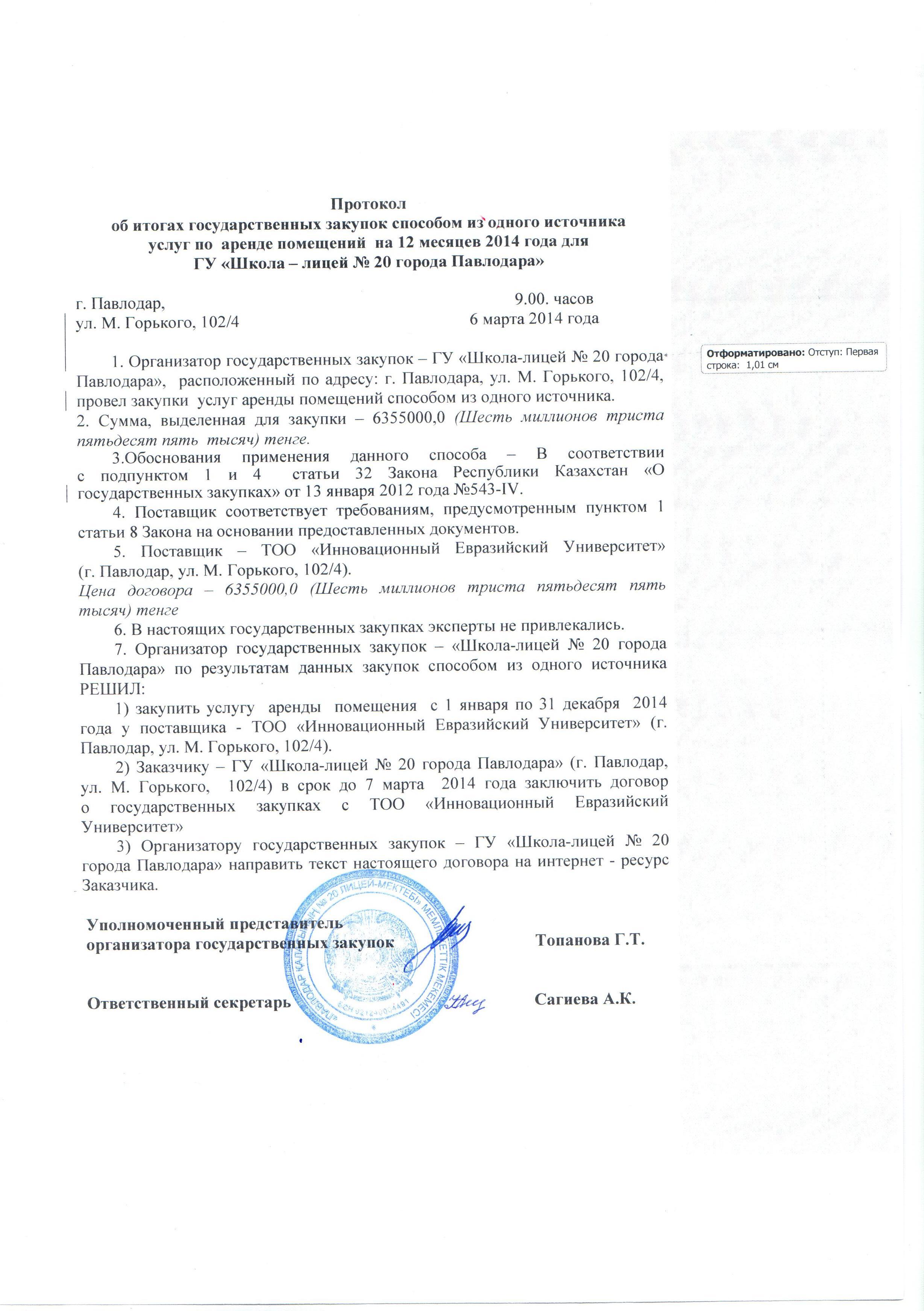 Протокол об итогах государственных закупок | Скачать |