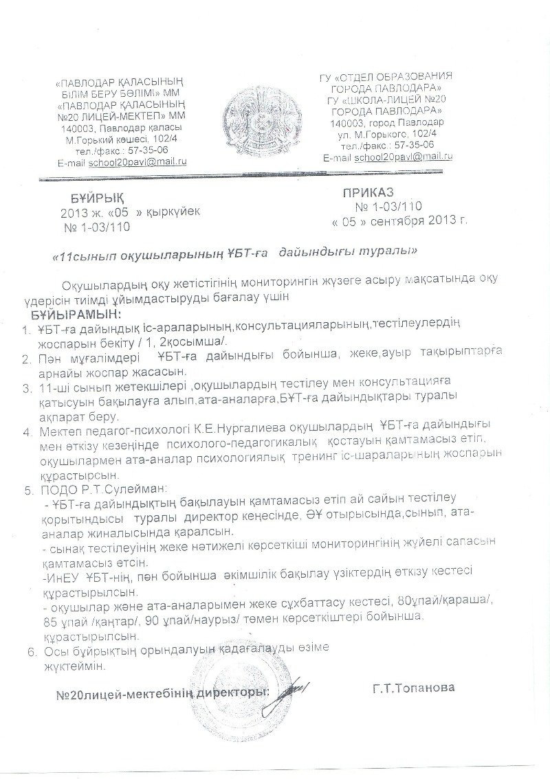 Павлодар қаласының №20 лицей-мектебінің 2013-2014 оқу жылының ҰБТ-ға дайындалуы мен өткізуін ұйымдастыру жоспары | Скачать |